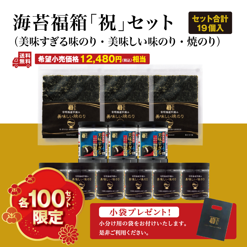 | 名称 | 海苔福箱「祝」セット(美味すぎる味のり・美味しい味のり・焼のり) |