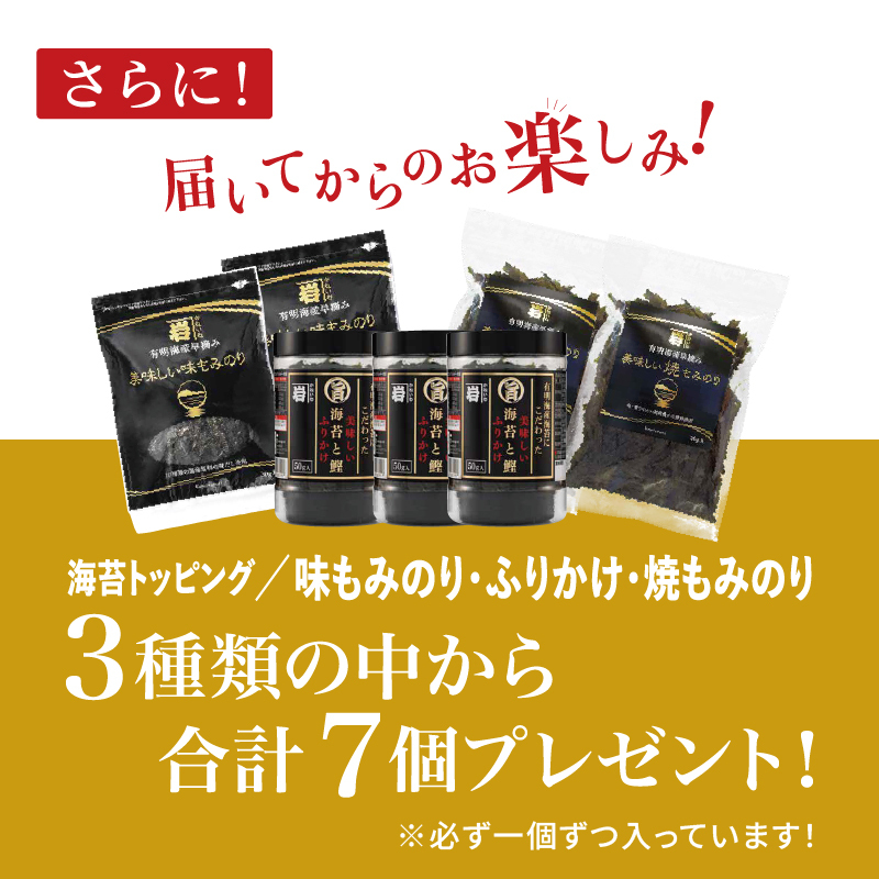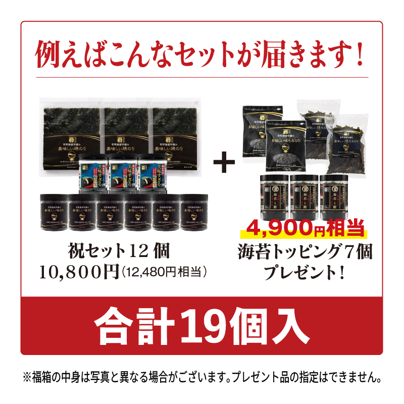 合計19個入り <祝セット12個> ・美味すぎる味のり80枚×3個 ・美味しい味のり60枚×6個 ・美味しい焼のり7枚×3個 + <海苔トッピング3種類> ・美味しい味もみのり30g ・美味しい海苔と鰹ふりかけ50g ・美味しい焼もみのり20g いずれか7個 ※福箱には基本の祝セット12個が必ず入っています。プレゼントのトッピング3種類の7個はランダムで同梱します(必ず全種類入っています) |