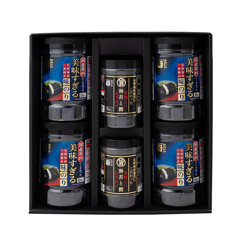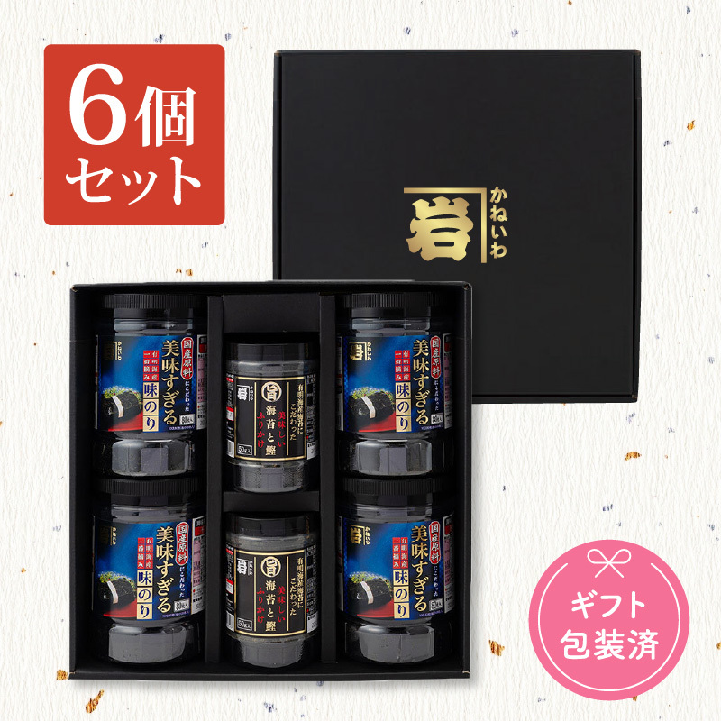 計6個入り ・美味すぎる味のり80 4個 ・美味しい海苔と鰹のふりかけ 2個  |